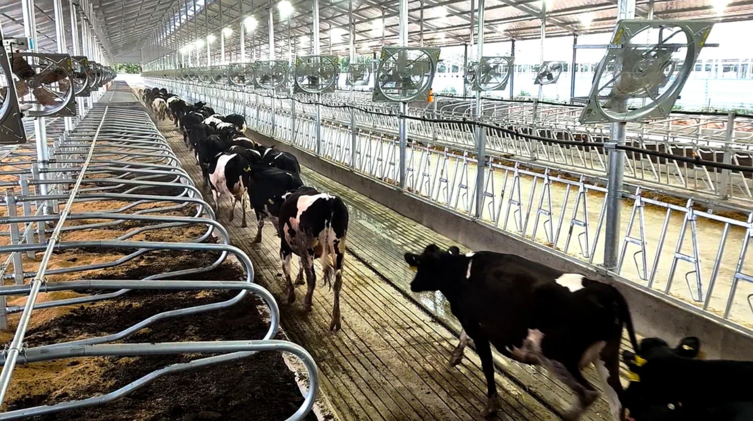 在37度高温下,走进智慧牧场,猛然感到一阵凉爽,只见一排排可自动调节转速的风扇正在“卖力工作”,一排排崭新的淋浴器这在往吃草的奶牛身上均匀喷水。不一会,吃饱喝足的奶牛开始躺到舒适的卧床上“打盹”,卧床通道里不见粪污堆积,空气中弥漫着奶牛饲料的清香。
